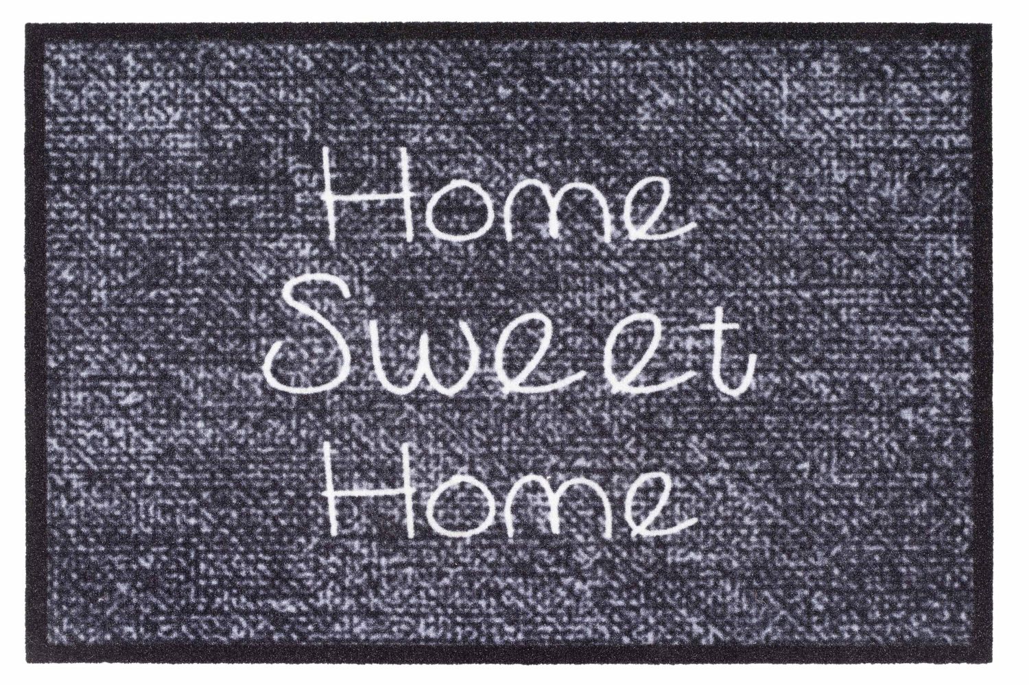 Fußmatte, Home sweet home auf dunkelgrauer Stoff Bodeneffekt, hergestellt aus Polyamidfasern zum Auffangen von Schmutz und Feuchtigkeit.